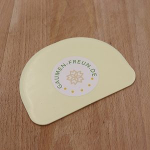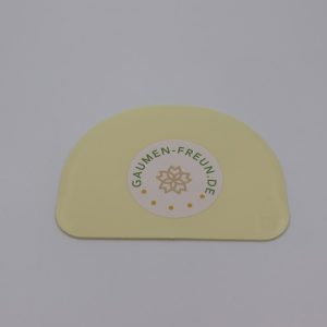 Gaumen-Freun.de - Teigkarte Größe: 12 x 8,8 cm Material: PP mit abgeschrägter Kante Auf Rückseite eingespritztes Logo "Gaumen-Freun.de" in Größe 56 x 14,5 mm Farbe: elfenbein Auf Vorderseite: Gaumen-Freun.de-Aufkleber ablösbar. Durch die abgeschrägte Kante, kann man Pasta besonders gut abschneiden.