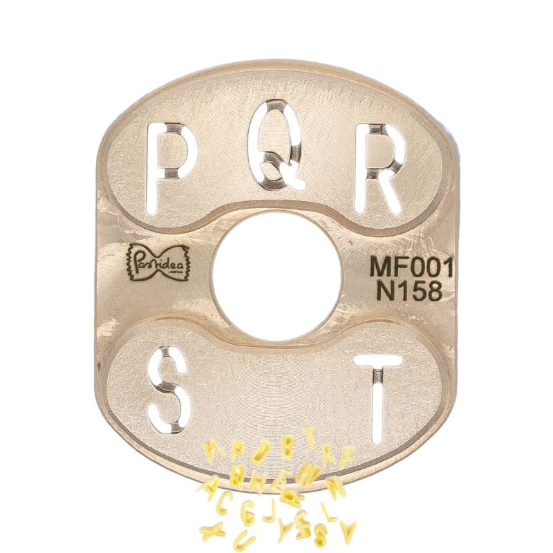 Inlay in Bronze - Alphabet Buchstaben P-Q-R-S-T Dieser Pasta-Matrizen-Einsatz ist kompatibel mit dem Classe Italy Pastaio und der Ariete 1581 Pastamatic. Ein Einsatzhalter (nicht im Lieferumfang enthalten) wird benötigt, um ihn auf diesen Maschinen zu verwenden. Material: Standard Bronze (Messing) Größe: 9 mm Stärke: 1 mm Warum Bronze: Bei Bronzematrizen und diesen neuen Einsätzen handelte es sich um die traditionelle Art der Pastamanufaktur. Zu finden sind die „al bronzo“ gefertigten Nudeln nur selten und meist nur in ausgewählten Feinkostläden. Durch das Pressen des Nudelteigs durch die Bronzematrizen wird die Oberfläche der Pasta gleichzeitig ganz leicht aufgeraut, die Nudel wird griffiger. Dadurch kann die Pasta später die Soße, Aromen und Gewürze besser aufnehmen. Rezept: Es empfiehlt sich die Verwendung von Hartweizengrieß, ausreichend kalter Flüssigkeit wie Wasser und/oder Ei. Der Teig sollte ca. 8-10 Minuten geknetet werden, nur so kann das Gluten vom Hartweizen sich voll entwickeln. Das Ergebnis sollte ein feucht krümeliger Teig sein. Wir empfehlen folgendes Standardrezept für unsere Matrizen: Zutaten: 250 g Hartweizengrieß bzw. Semola rimacinata Wählen Sie EINE der folgenden Zutaten aus: 100 ml kaltes Wasser oder 110 ml Flüssigkeit bestehend aus zwei Eiern, Rest Wasser, leicht verquirlt Anleitung: Bitte nur kalte Flüssigkeiten verwenden. Mehl vermeiden, besser durch Grieß ersetzen. Bindemittel wie Xanthan, Gluten, etc. nur in geringem Umfang einsetzen, maximal 1 Teelöffel auf 500 gr trockener Zutaten. Der Teig wird ansonsten zu fest, die Matrizen könnten brechen. Wenn man den Teig länger knetet bzw. ruhen lässt, entwickelt sich das Gluten von alleine. Einen guten Nudelteig erkennt man daran, dass er feucht bröselig ist. Auch die Produktion von glutenfreien Nudeln ist mit den Einsätzen möglich. Kurz zum neuen System: Dieses neue System zur Nudelherstellung ermöglicht es Ihnen, die verschiedenen Inlays (für die vers. Nudelformen) zu nutzen. ✔ Nachhaltiger und günstiger gegenüber dem alten System ✔ Einfacher zu reinigen, da sie demontiert werden können ✔ Verfügbare Einsätze in POM oder "Bronze" (eine Legierung) ✔ Von Pastidea patentiert, nicht anderswo verfügbar ✔ Kleiner und einfacher zu lagern die Nachteile: ✘ Nicht alle Pastaformate sind mit Inlays realisierbar<p> ✘ Derzeit sind noch nicht viele Formen verfügbar, eher die oft nachgefragten Standardnudelformen (aber es werden bald weitere kommen) Hinweise: Bitte beachten Sie, dass material- und produktionsbedingt die Einsätze in Bronze kleinere dunkle Stellen aufweisen können. Dies ist dem Material geschuldet und beeinträchtigt nicht die Funktion. Die Einsätze sind nicht spülmaschinenfest und sollten nach Reinigung sofort abgetrocknet werden, um Wasserflecken zu vermeiden.