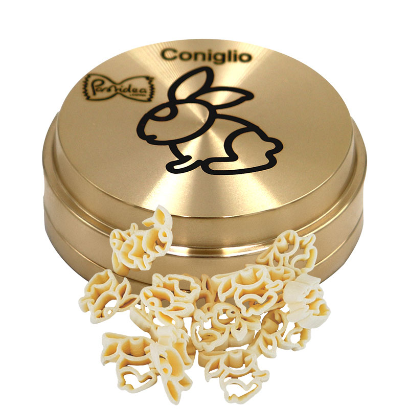 Matrize Bronze Dackel (Hund) Größe: 22 mm Dicke: 1 mm Teigwareneinsatz für Kenwood AT910, AX910, KAX910ME, PP510, KAX92.AO, KAX91.A0ME. Mit Adapter kann die Matrize in vielen weiteren Nudelmaschinen genutzt werden, z.B. Philips Pastamaker Avance, Philips Viva, KitchenAid, Simac, Ariete, Unold, La Fattorina, Firmar, TR50, Häussler, Korngold, Omega. Geliefert wird die Matrize zusammen mit einer durchsichtigen Transportschutzdose. Warum Bronze: Bei Bronzematrizen handelte es sich um die traditionelle Art der Pastamanufaktur. Zu finden sind die „al bronzo“ gefertigten Nudeln nur selten und meist nur in ausgewählten Feinkostläden. Durch das Pressen des Nudelteigs durch die Bronzematrizen wird die Oberfläche der Pasta gleichzeitig ganz leicht aufgeraut, die Nudel wird griffiger. Dadurch kann die Pasta später die Soße, Aromen und Gewürze besser aufnehmen. Möchten Sie mehr über Bronzematrizen erfahren? Dann empfehlen wir Ihnen den Artikel hier. Rezept: Es empfiehlt sich die Verwendung von Hartweizengrieß, ausreichend kalter Flüssigkeit wie Wasser und/oder Ei. Der Teig sollte ca. 8-10 Minuten geknetet werden, nur so kann das Gluten vom Hartweizen sich voll entwickeln. Das Ergebnis sollte ein feucht krümeliger Teig sein. Ein Standardrezept für unsere Matrizen finden Sie hier. Auch die Produktion von glutenfreien Nudeln ist mit den Matrizen möglich. Nachhaltigkeit: Ursprünglich konzipiert wurde das Format der Pastidea-Matrizen für die Kenwood Pastafresca. Durch den Einsatz von Reduzierringen können die Bronzematrizen auf fast allen anderen gängigen Nudelmaschinen eingesetzt werden. Man benötigt lediglich einen zur Maschine passenden Adapter. D.h. auch wenn im Laufe der Zeit die Nudelmaschine durch Defekt oder aus anderen Gründen durch ein anderes Modell ersetzt wird: die Bronzematrize bleibt und kann auch in Zukunft weiter verwendet werden. Aufbewahrung: Sie haben mehrere Bronzematrizen und suchen nach einer Aufbewahrung, um die Matrize von Staub und Nachdunkeln durch Lichteinflüsse zu schützen? Dann empfehlen wir Ihren unsere Aufbewahrungssysteme, die Sie ebenfalls in unserem Sortiment finden. Hinweise: Bitte beachten Sie, dass material-und produktionsbedingt die Matrizen kleinere dunkle Stellen aufweisen können. Dies ist dem Material geschuldet und beeinträchtigt keinerlei die Funktion. Die Matrizen sind nicht spülmaschinenfest. Sollten nach Reinigung jeweils sofort abgetrocknet werden, um Wasserflecken zu vermeiden.