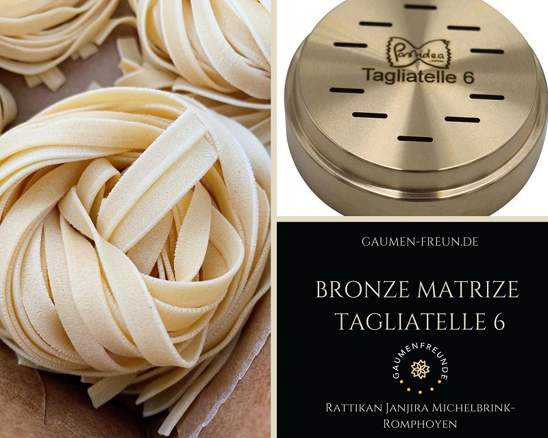 Tagliatelle im allgemeinen sind immer zwischen 6 und 8 mm breit. Wobei man sie in Deutschland häufiger um die 6 mm breit findet, in Italien meist eher um die 8 mm breit. D.h. diese Tagliatellematrize mit 6 mm ist eher so wie man die Pasta in Deutschland im Geschäft findet.