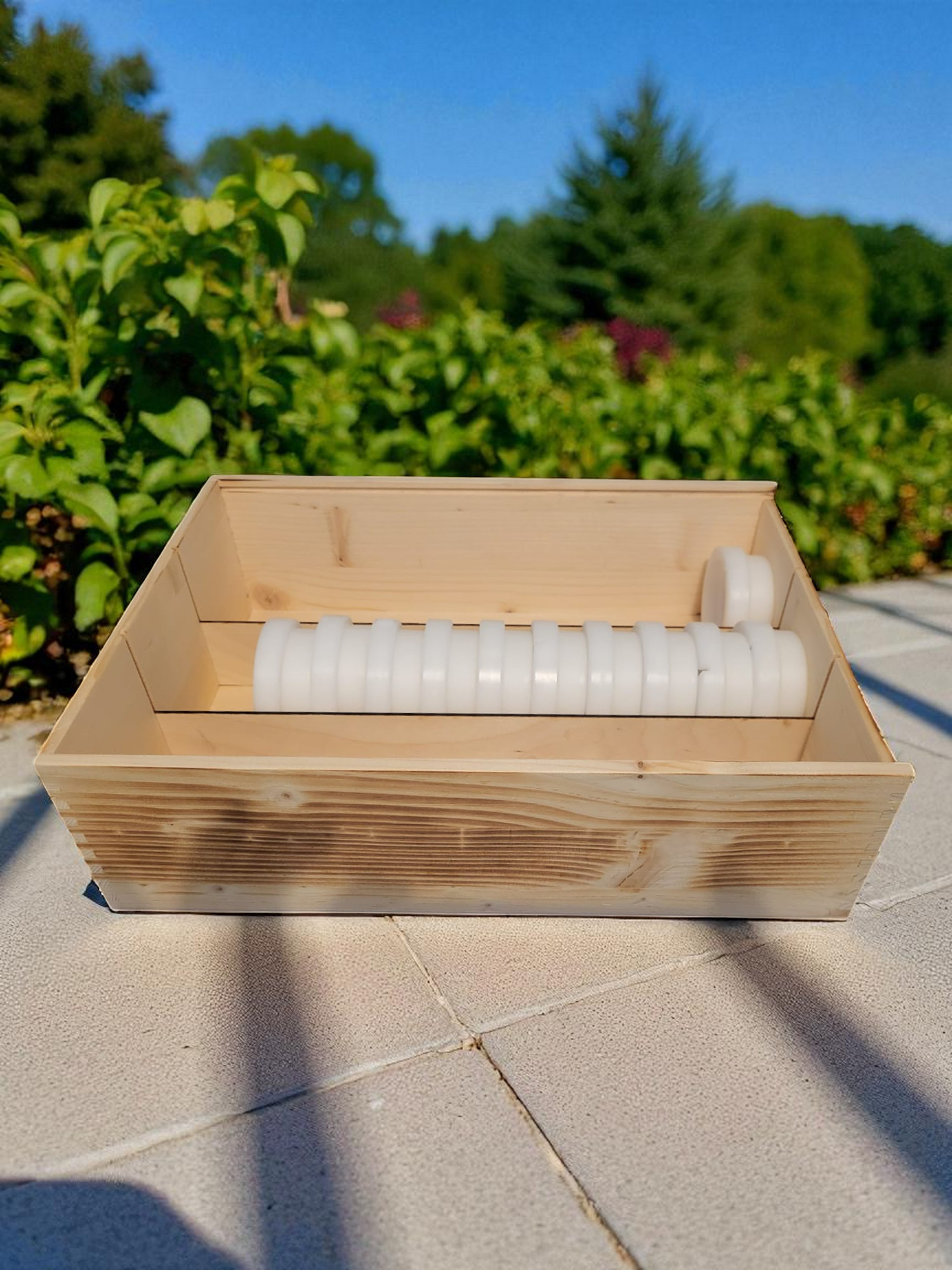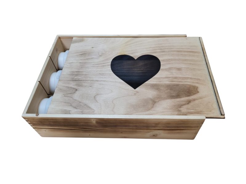 Die Holzbox verfügt über einen Schiebedeckel