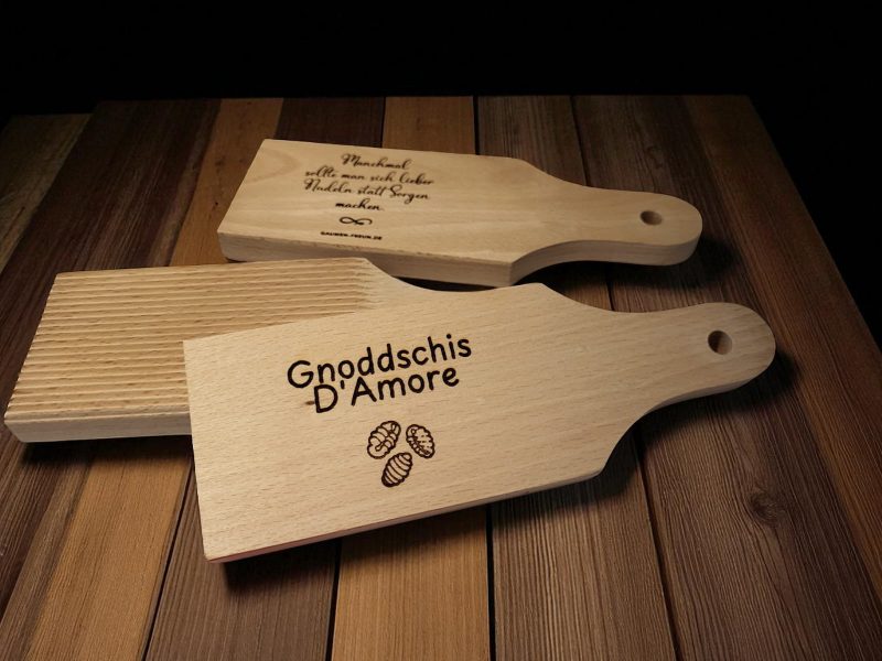 Kompaktes Gnocchibrettchen – Buchenholz in Sonderedition mit Lasergravur “Nudeln statt Sorgen”